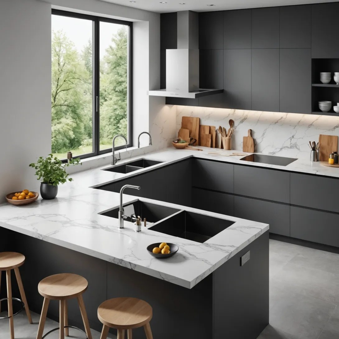 - Возможность использовать различные материалы столешниц, включая натуральный камень и композит.